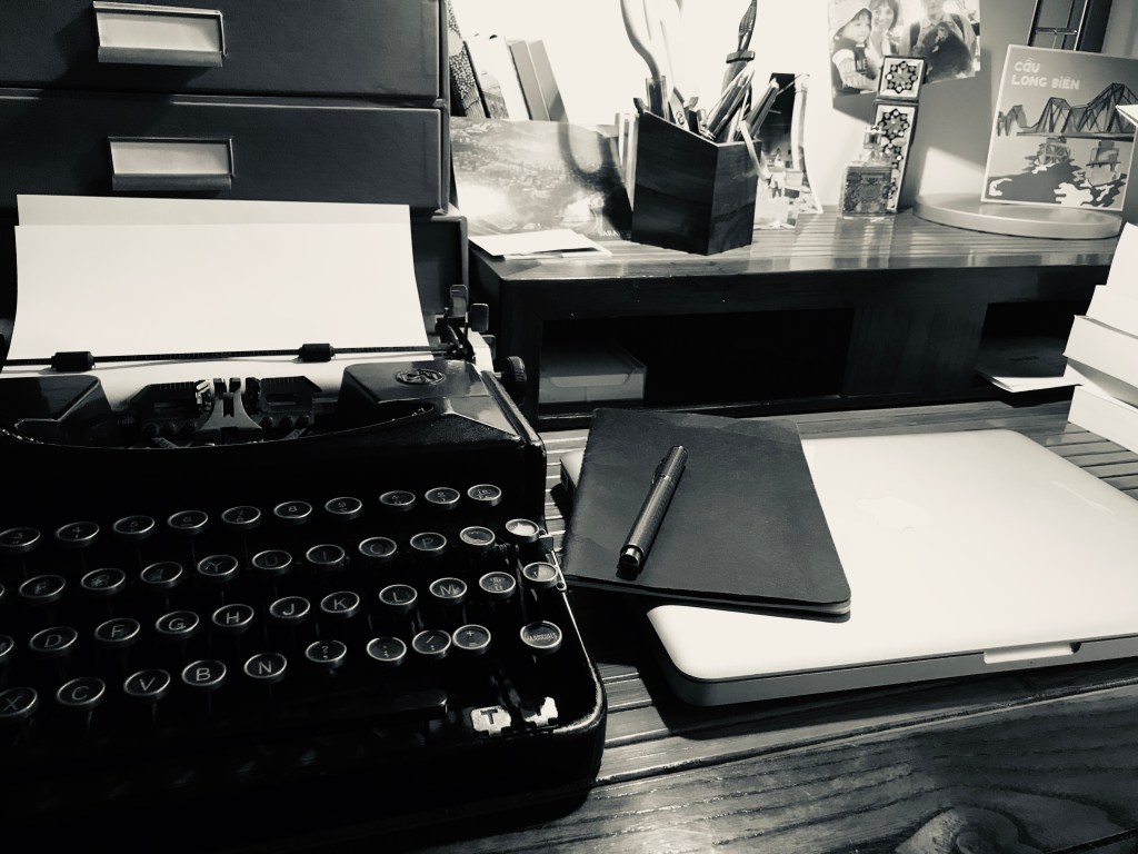 Je m’installais à mon bureau, un vieux bureau américain qui lui aussi venait de la cave du notaire, et j’écrivais. J’essayais en tout cas. Ici, je dois quelques explications aux plus jeunes d’entre vous. Il fallait dompter la bête avant d’aligner quelques mots. Bien entendu je ne tapais qu’avec deux doigts. Et il fallait frapper assez fort sur chaque touche pour être certain de correctement encrer le papier. Maîtriser le « retour charriot » était une étape indispensable pour aller à la ligne. Changer le ruban d’encre exigeait une certaine dextérité, surtout sur ce matériel moyenâgeux et ne perdons pas de vue que le tac, tac, tac de la machine dérangeait tout le monde.